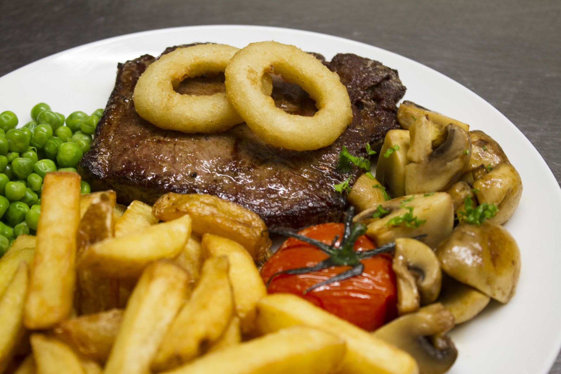 served with chunky chips,tomato, mushrooms & peas. GF